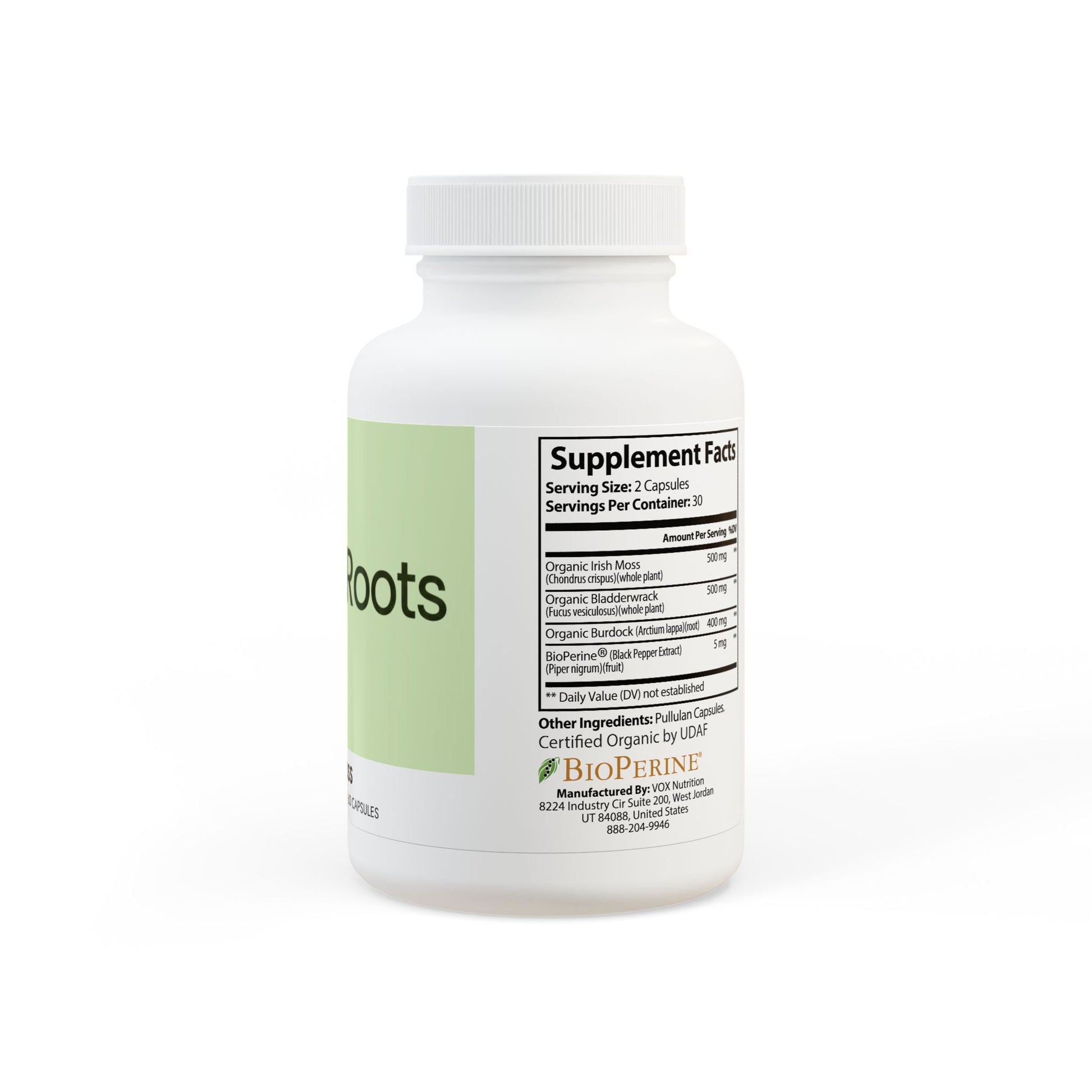 Ingredients: Organic Irish Moss (Chondrus crispus)(whole plant), Organic Burdock (Arctium lappa)(root), Organic Bladderwrack (Fucus vesiculosus)(whole plant), BioPerine® (Black Pepper Extract), (Piper nigrum)(fruit). Other Ingredients: Pullulan Capsules.